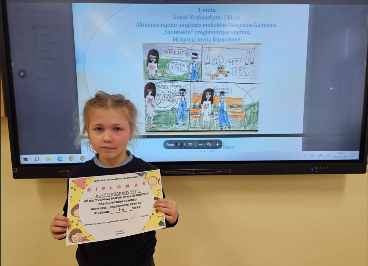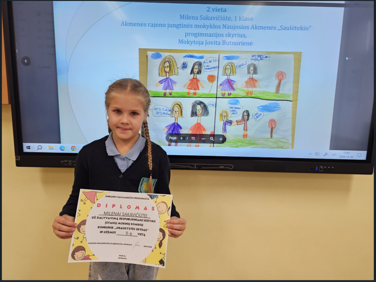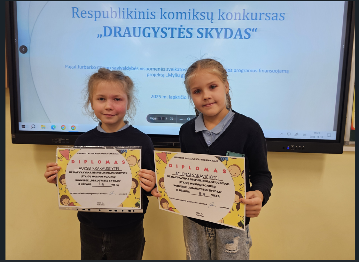 Mūsų progimnazijos skyriaus 1a klasės mokinės Auksė Krakauskytė ir Milena Sakavičiūtė konkursui pristatė savo komiksus, kuriuose kūrybiškai atskleidė draugystės ir bendravimo su bendraamžiais temą. Pirmokų grupėje mokinės tapo nugalėtojomis. Auksė užėmė I vietą, o Milena – II vietą. Konkurso dalyvės apdovanotos diplomais.