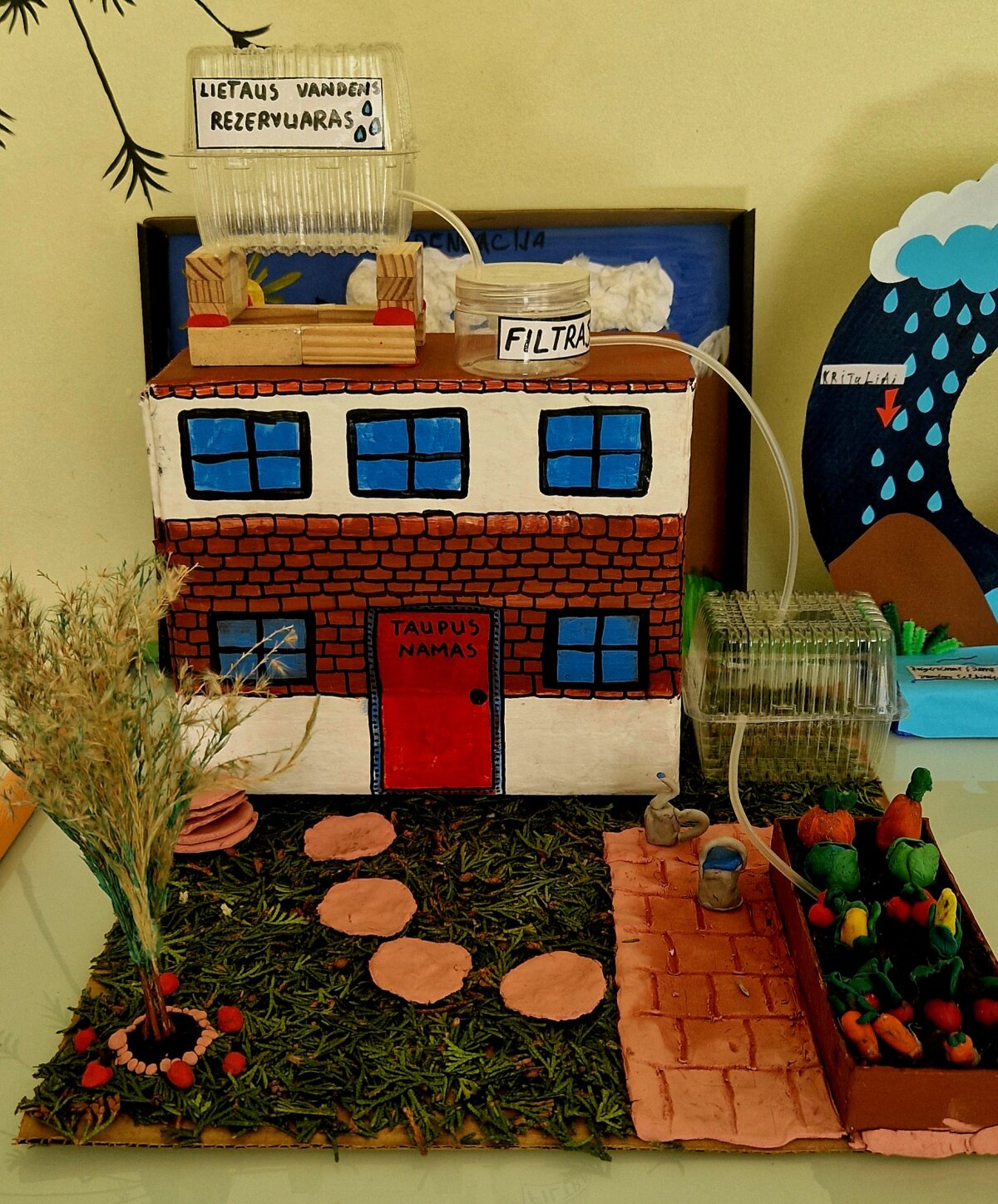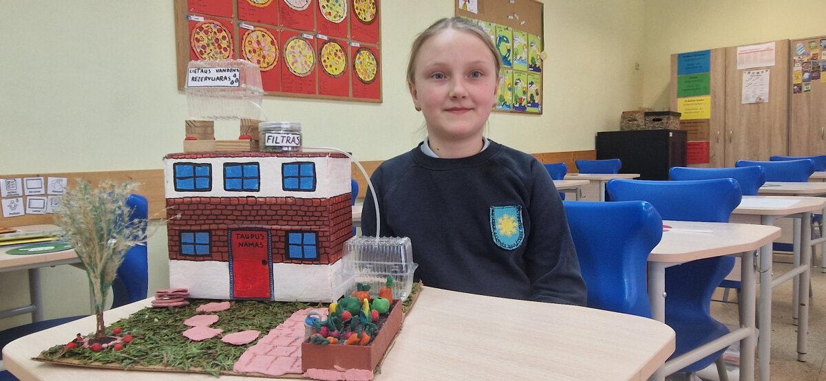 Elija nuotoliu pristatė savo parengtą darbą tema „Ekologiški namai. Lietaus vandens panaudojimas“. Mokinė iš antrinių žaliavų ir gamtinių medžiagų sukonstravo namo, kuris surenka lietaus vandenį, jį išfiltruoja ir leidžia panaudoti išvalytą vandenį buityje, maketą.