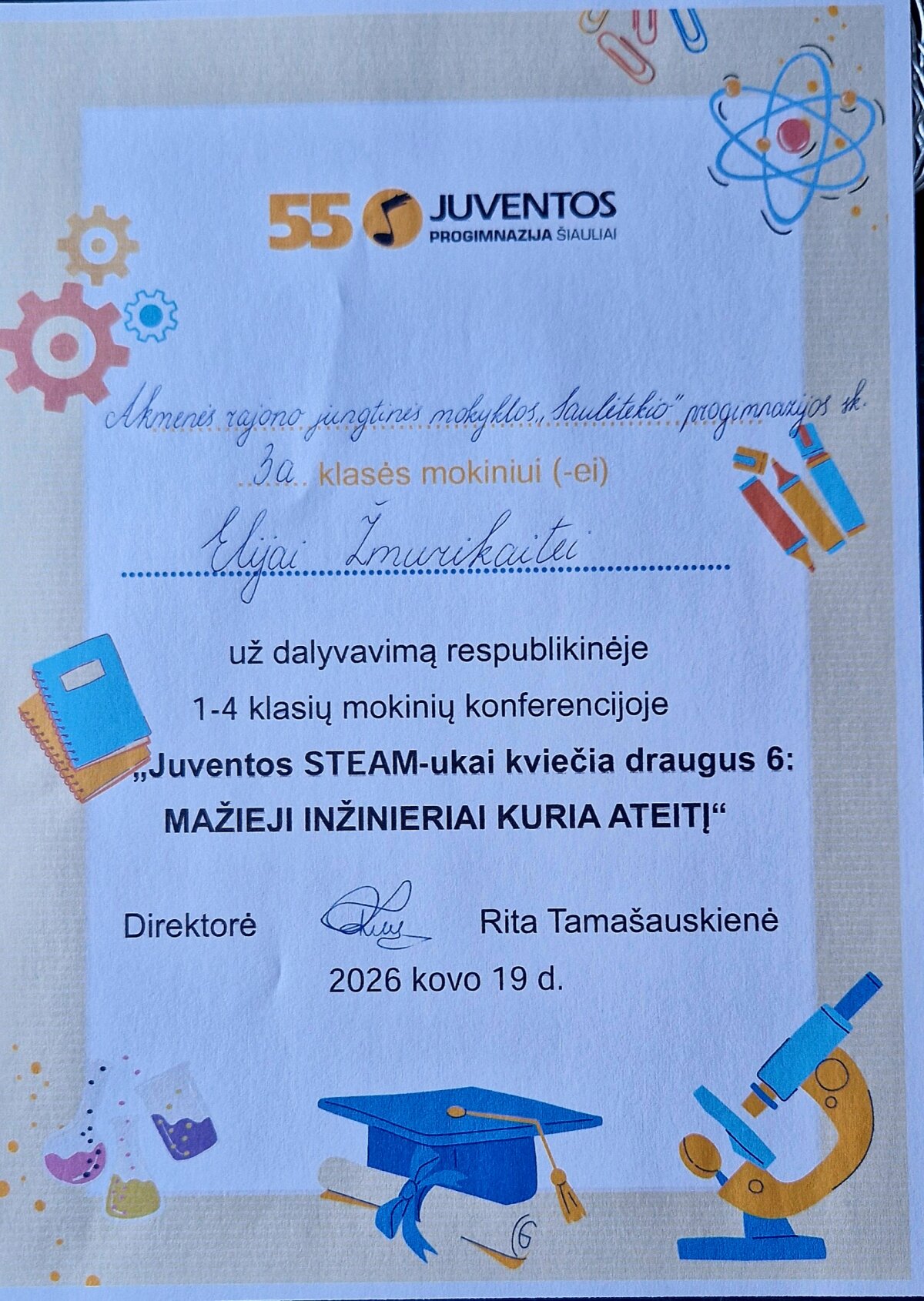 Kovo 19 dieną 3a klasės mokinė Elija Žmurikaitė dalyvavo Šiaulių „Juventos“ progimnazijos organizuotoje respublikinėje mokinių konferencijoje „Juventos STEAM-ukai kviečia draugus 6: mažieji inžinieriai kuria ateitį“. Šių metų konferencija buvo skirta inžinerijos ir tvarumo temoms. Konferencijoje net 45 pranešėjai dalinosi savo tyrimais, demonstravo sukonstruotus inžinerinius statinius: tiltus, malūnus, švyturius, ir daugybę kitų atradimų.