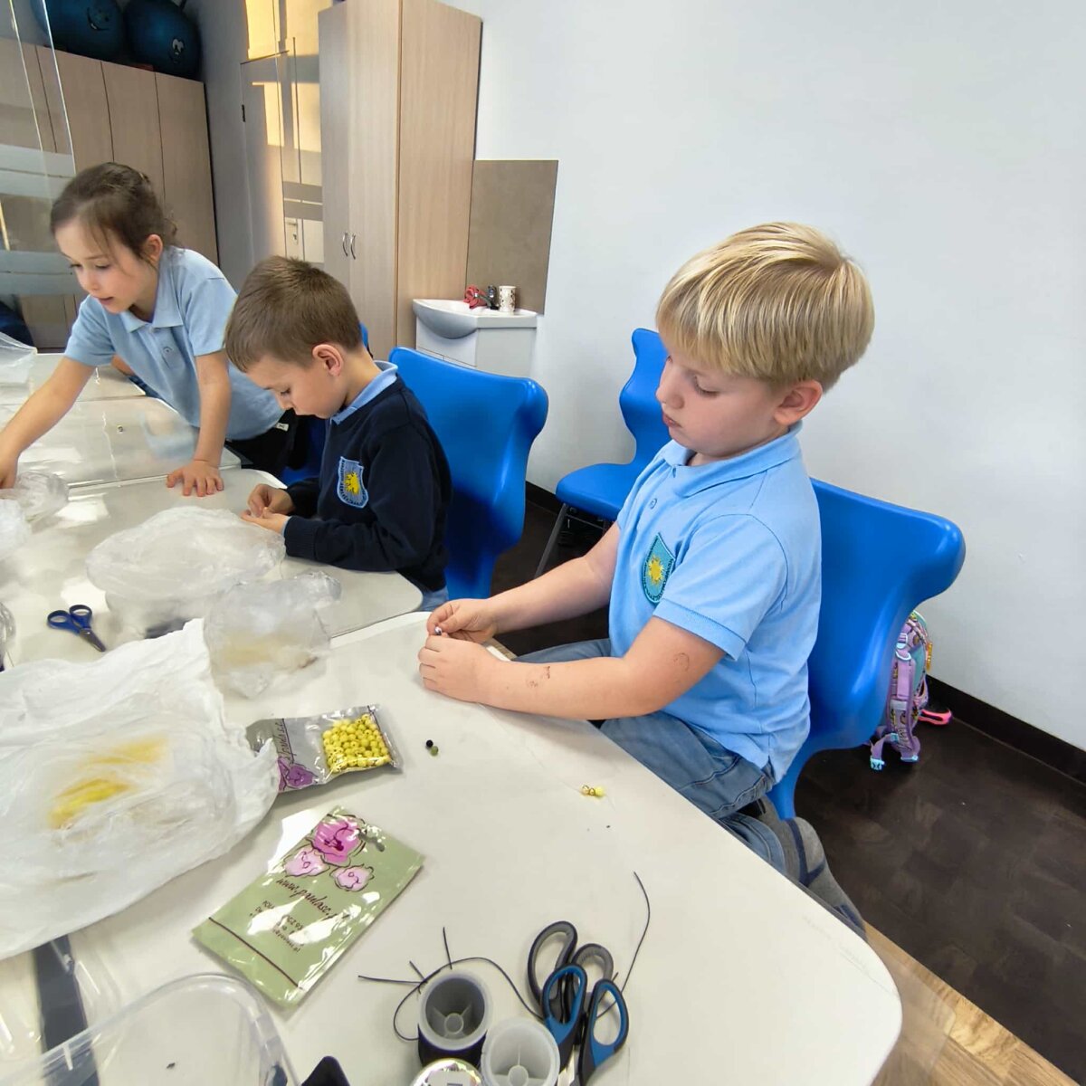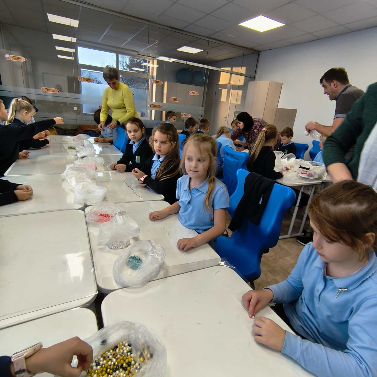 Vėliau visi galėjo susikurti po apyrankę iš spalvotų karoliukų. Vaikai dirbo susikaupę, bet kartu labai džiugiai – dalinosi idėjomis, rinkosi spalvas, rodė vieni kitiems savo kūrinius.