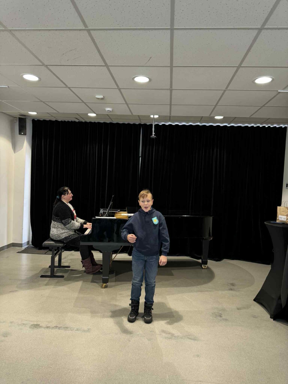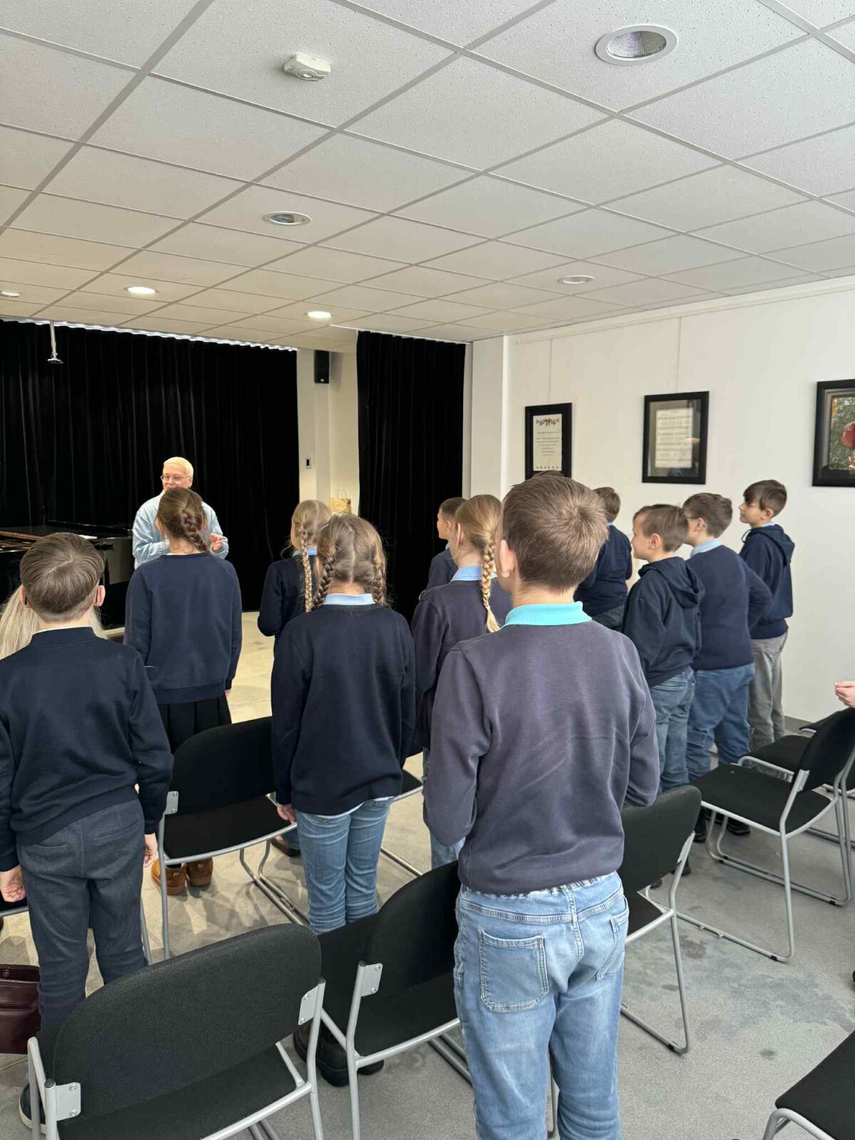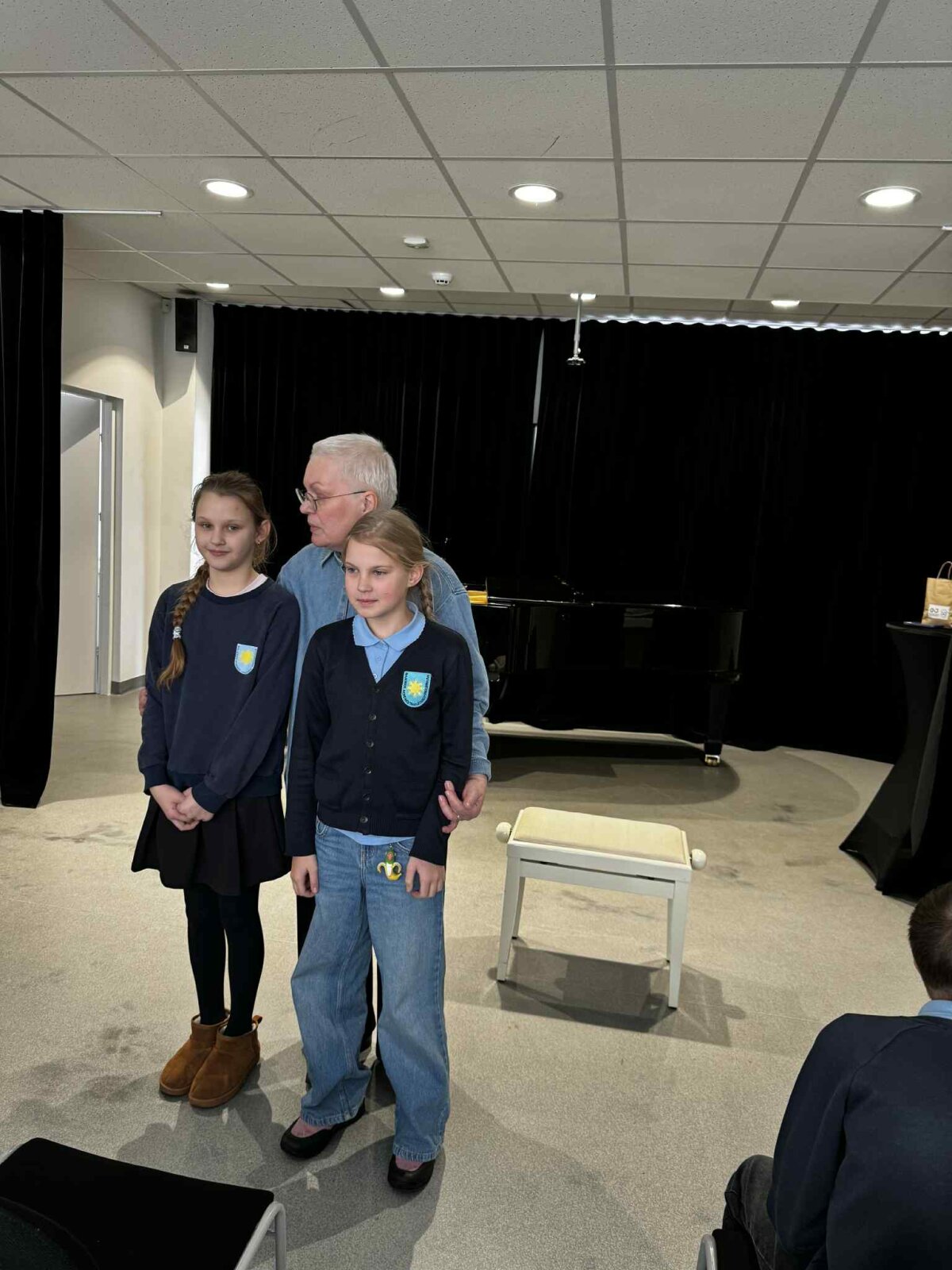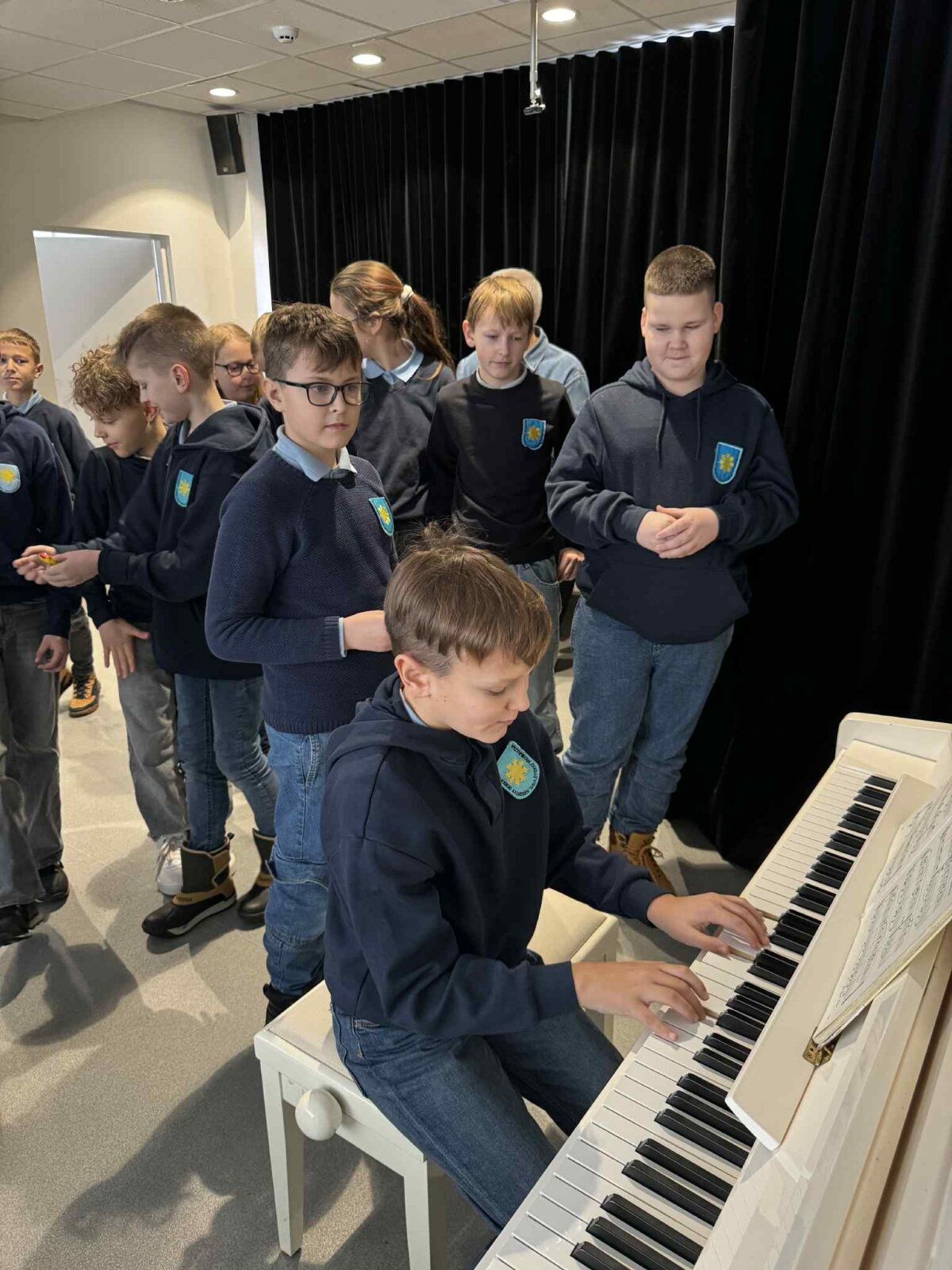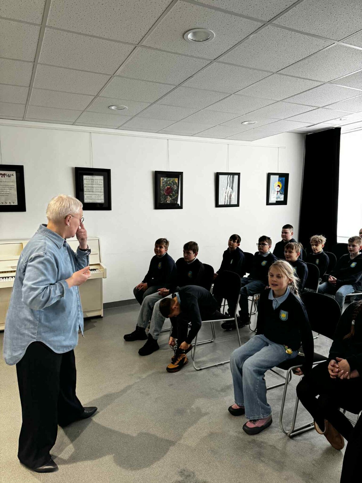 Smagiausia buvo paklausyti, kaip klasės draugai Eglė, Urtė ir Augustas skambina pianinu. Susidomėję stebėjome jų pasirodymus, palaikėme atlikėjus. Ypatingą nuotaiką sukūrė Augustas, drąsiai padainavęs mums žemaitišką dainelę akompanuojant koncertmeisterei Yevheniiai Popudrenko.