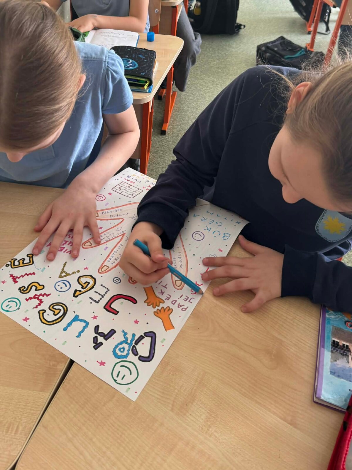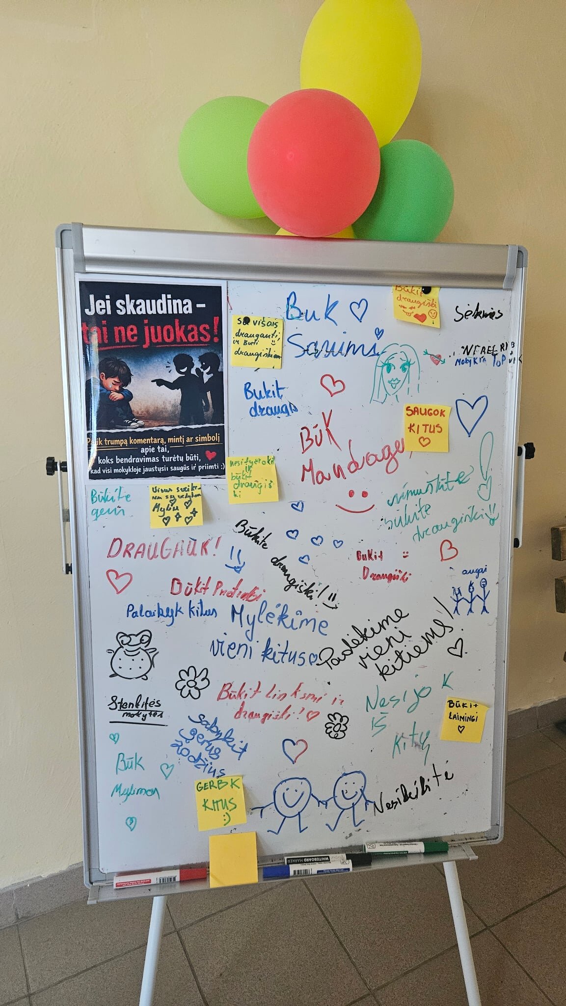 5-8 klasių mokiniams buvo parengtas stendas su žinute „Jei skaudina – tai ne juokas“. Mokiniai rašė trumpus komentarus, mintis, piešė simbolius apie tai, koks bendravimas turėtų būti, kad visi mokykloje jaustųsi saugūs ir priimti.