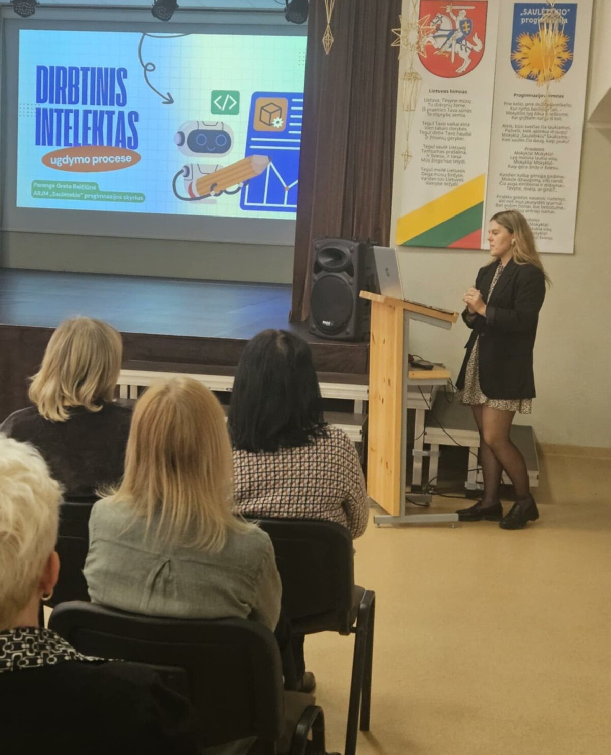Idėjų mugę užbaigė pradinių klasių mokytojos Gretos Balčiūnės pranešimas apie dirbtinio intelekto taikymą ugdymo procese. Pranešime aptartos galimybės modernizuoti pamokas ir padėti mokiniams mokytis efektyviau..