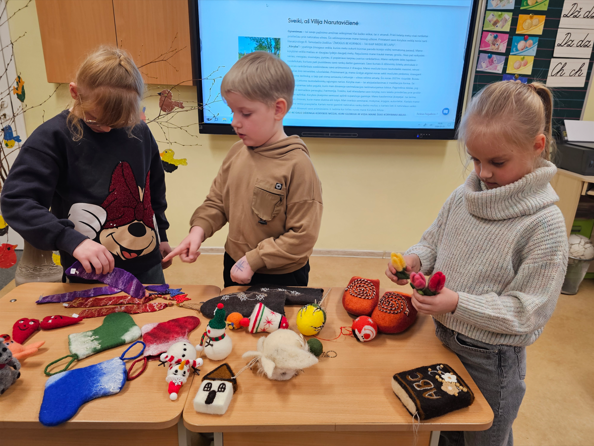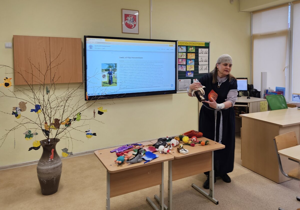 Klasėje svečiavosi tautodailininkė Vilija Narutavičienė. Edukacijos dalyviai susidomėję klausėsi pasakojimo apie senąjį amatą – vėlimą iš vilnos, lietuvių liaudies tautodailės tradicijas, apžiūrėjo menininkės atsivežtus rankų darbo gaminius.