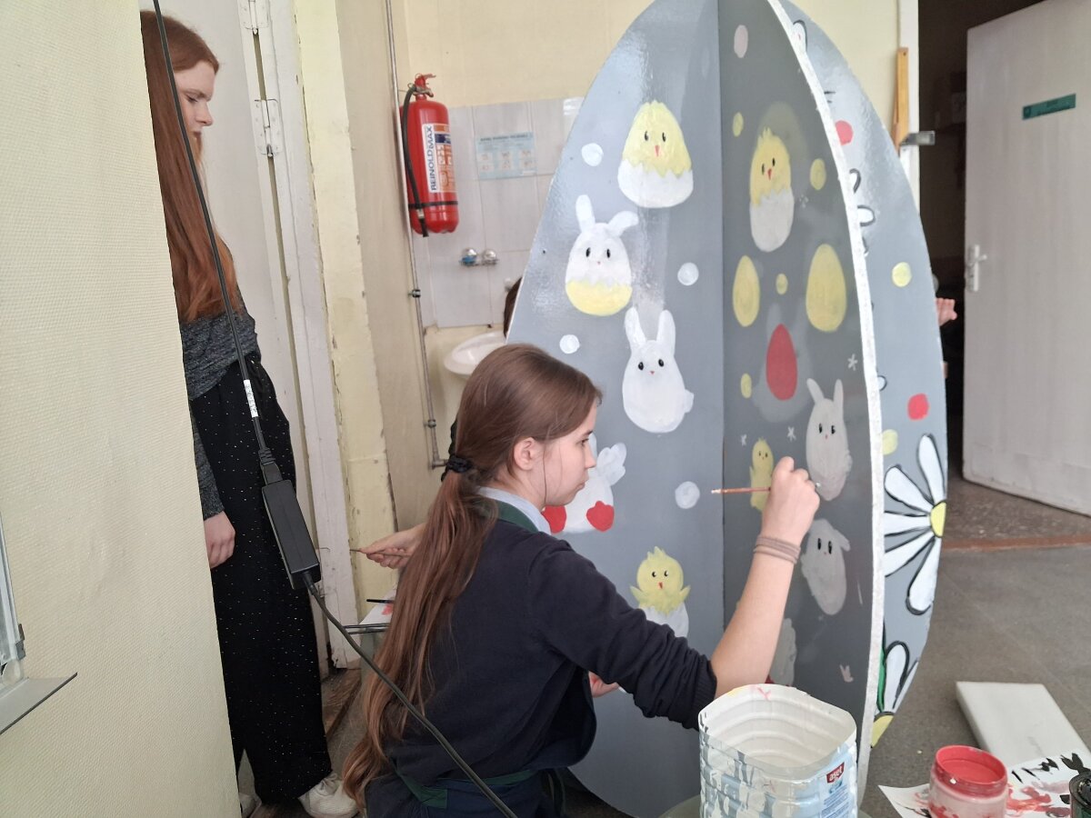 Mokiniai kartu su mokytojais į šią užduotį pažvelgė itin kūrybiškai. Iš plokštės buvo išpjauta įspūdingo dydžio, net 1,5 metro aukščio kiaušinio forma, kuri tapo drobe mūsų jauniesiems kūrėjams. Vaikai margutį spalvino ryškiausiomis pavasario spalvomis, į kiekvieną teptuko potėpį įdėdami daug kruopštumo, šilumos ir geros nuotaikos.